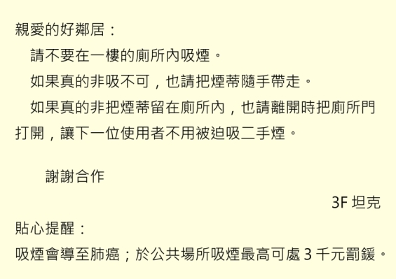 不過到目前為止都沒有人再去一樓廁所裡抽煙啦